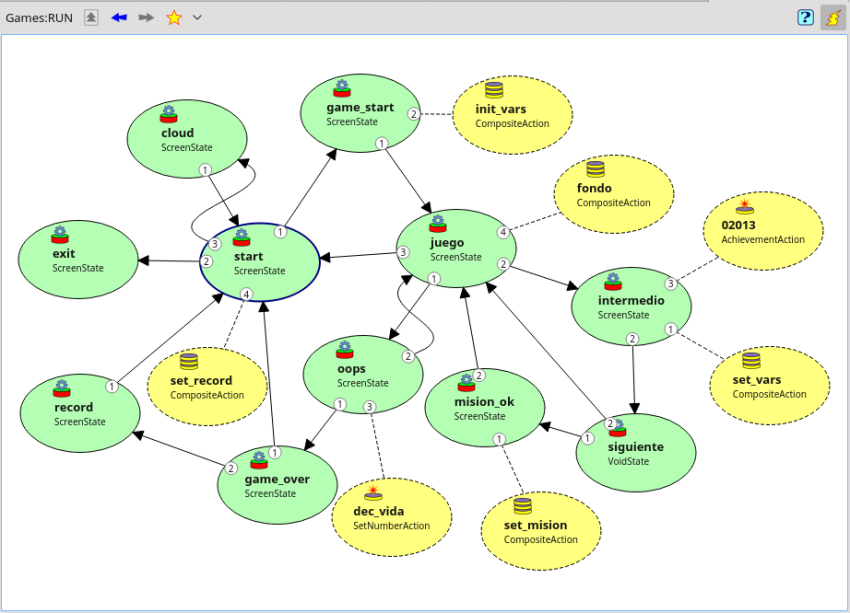 Al seleccionar una máquina de estados en la ventana del explorador, se carga dicha máquina en el editor de máquinas de estados. Se puede seleccionar un estado o una transición, clikeando con el ratón sobre su representación o en el explorador.