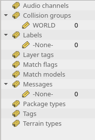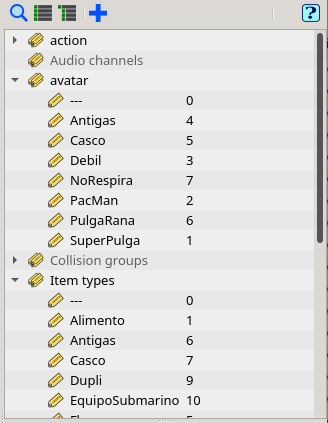 En esta clase de ventana se accede a todos los símbolos del proyecto. Valores simbólicos usados para clasificar algunos objetos. Como por ejemplo: grupos de personajes, sensores, acciones que representan las animaciones, niveles, mensajes intercambiados entre personajes, etc.